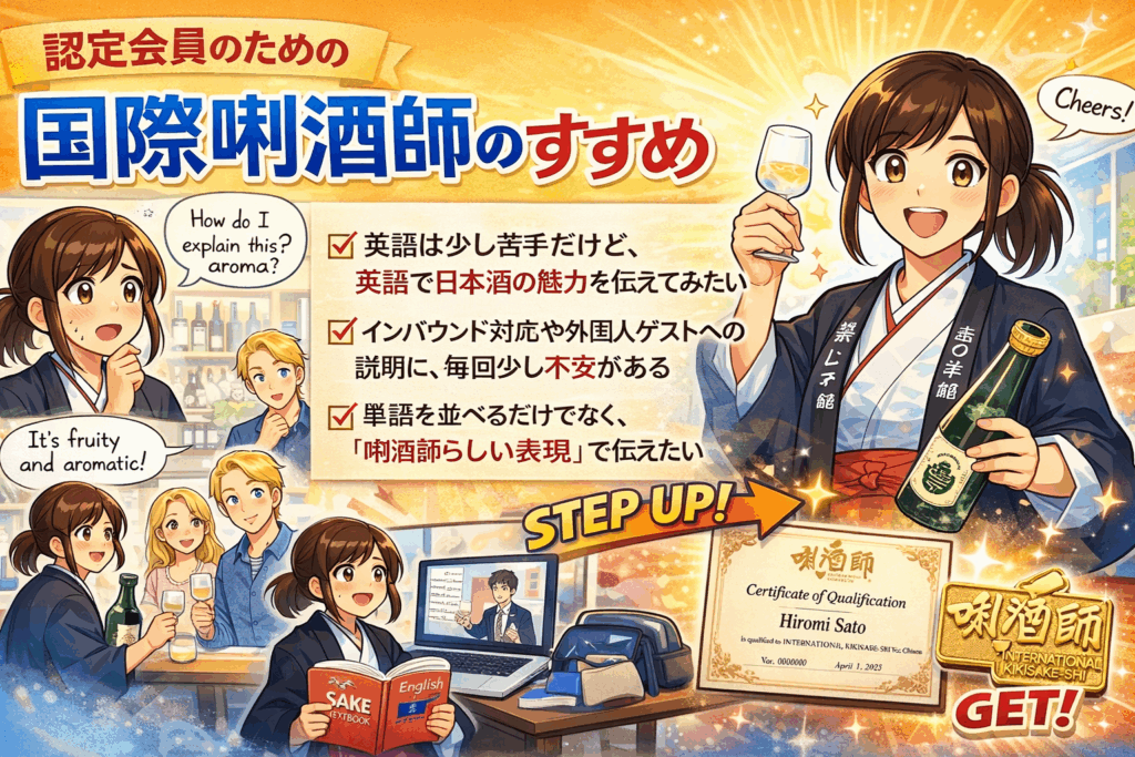 国際唎酒師は、すでに唎酒師として活動している認定会員の皆さまが、これまで身につけてきた知識を土台に、日本酒の魅力を“外国語で、自然に・的確に伝える力”を広げる資格です。
