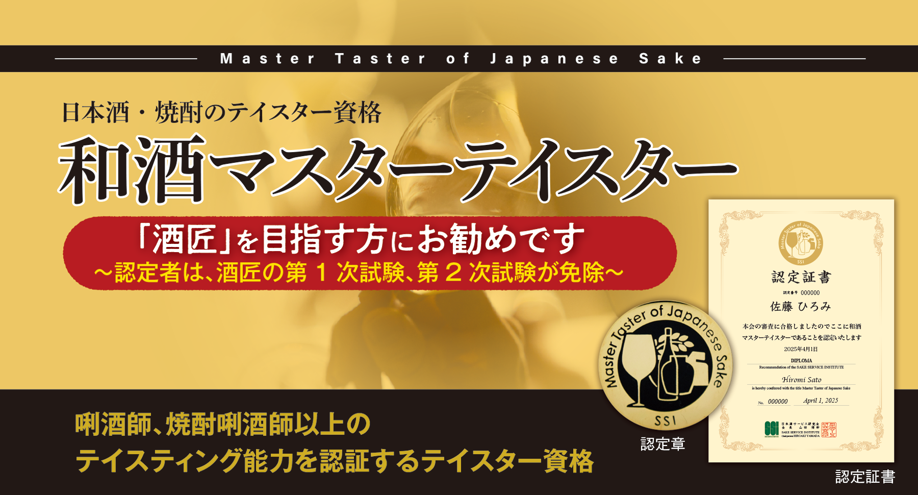 和酒マスターテイスターとは、「和酒」、すなわち、日本を代表する醸造酒「日本酒」と、日本を代表する蒸留酒「焼酎」を対象とし、唎酒師、焼酎唎酒師以上のテイスティング能力を認証するテイスター資格です。